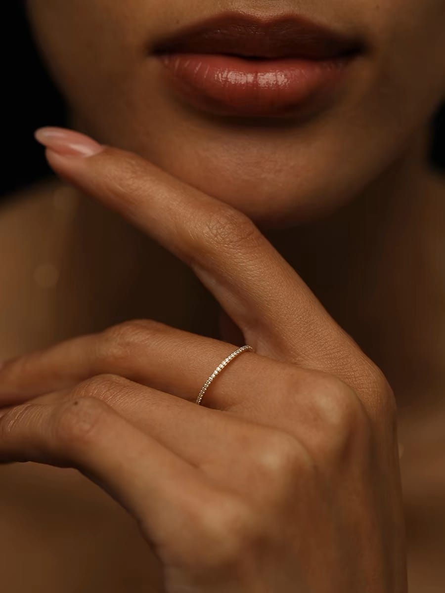 This ring is made of 18K gold and set with natural diamonds in a full eternity band style. The total carat weight of the diamonds is approximately 18 to 20 points, and the band is about 1 millimeter wide. It features extremely fine diamonds. I made this ring because I thought there might be others like me who just want to wear a thin diamond ring to add a touch of elegance to themselves, like having diamond tattoos on their fingers.