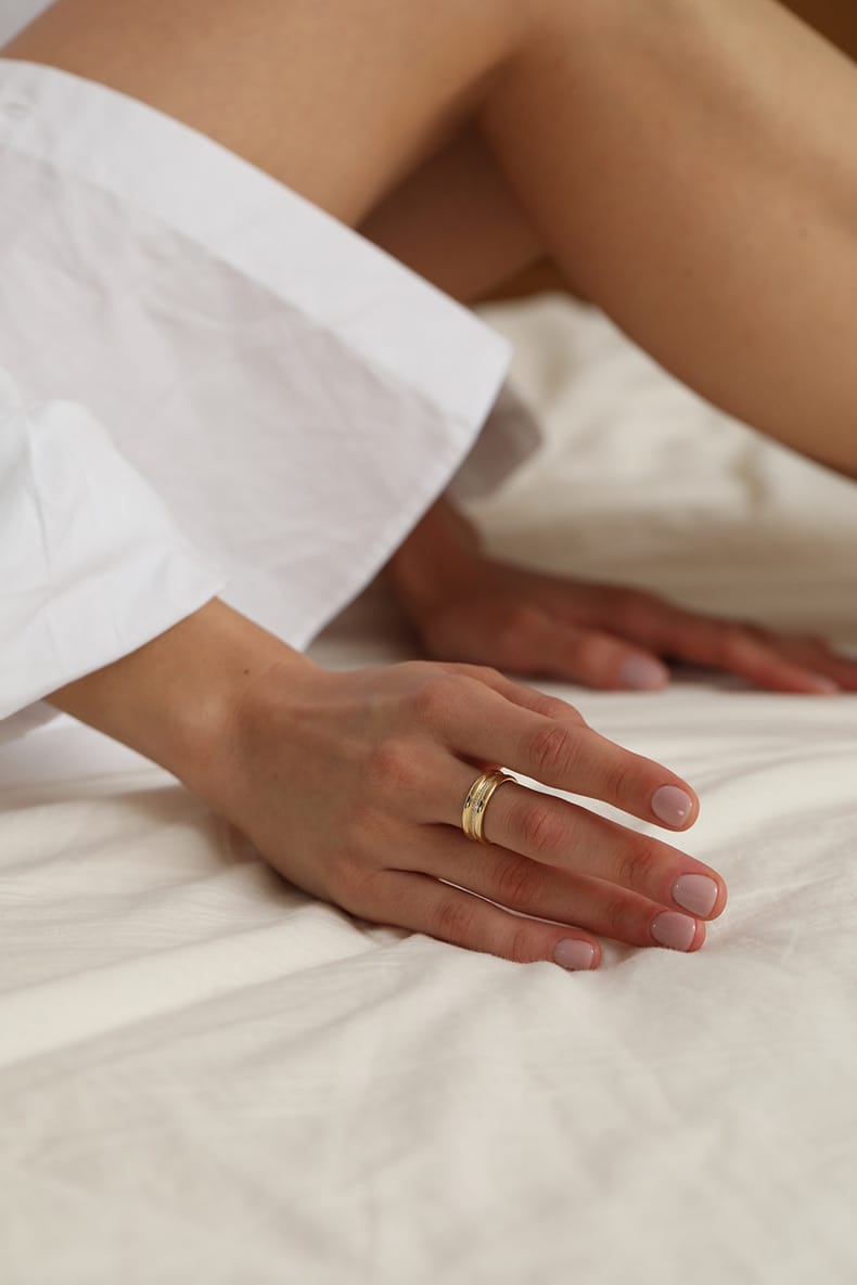 Crafted from 18K gold, this ring features a total of approximately 14 to 20 points of natural diamonds, meticulously set in a full circle around the band. With a width of about 6.3 millimeters and weighing approximately 4 to 6 grams, this ring offers substantial elegance. Please note that resizing is not possible for this ring, so we recommend selecting a size larger than usual for a comfortable fit.